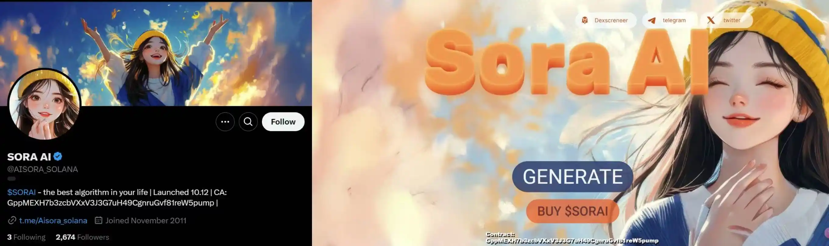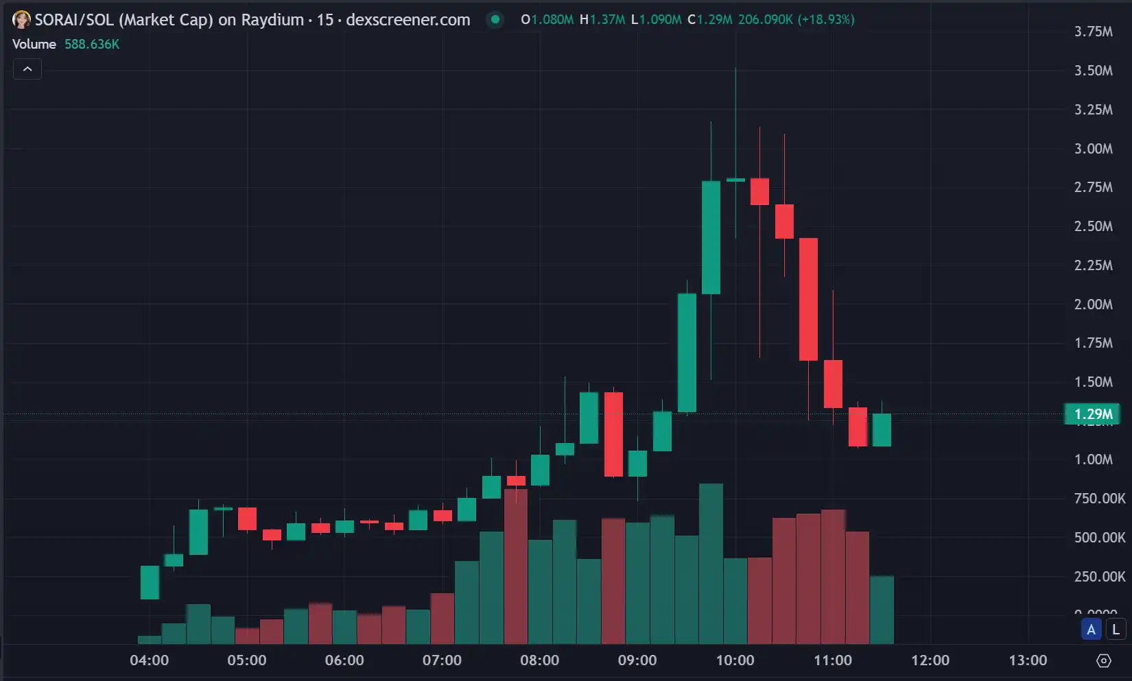 SORAI 代币背景围绕着 AI 生成的一个小女孩形象,网友们猜测它与 OpenAI 的视频生成 AI 项目「Sora」有一定关联。尽管$SORAI 官网上只有相关的数据,而没有更深入的信息,但其独特的背景和潜力吸引了大量关注,而且热度持续上升,交易量相对不错。代币在打满发射后经历了爆发式上涨,最高市值一度达到 352 万美元,涨幅达到 36 倍,随后快速回调,波动较大。