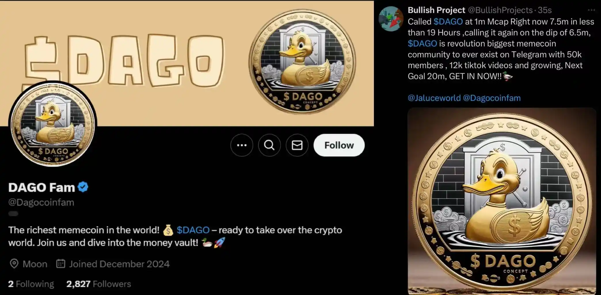 $DAGO 代币以唐老鸭这一经典迪士尼角色为核心,唐老鸭在漫画中被描绘为世界上最富有的鸭子,全球粉丝特别的多。该代币借势 TikTok 和 Telegram 的影响力,成为当前热门的社交媒体话题,特别是在 TikTok 上的趋势推动了它的曝光度。DAGO 代币市值最高飙升至 1021 万美元,但之后有所回调,目前市值为 233 万美元,尽管如此,目前代币的市场热度依旧不容小觑。