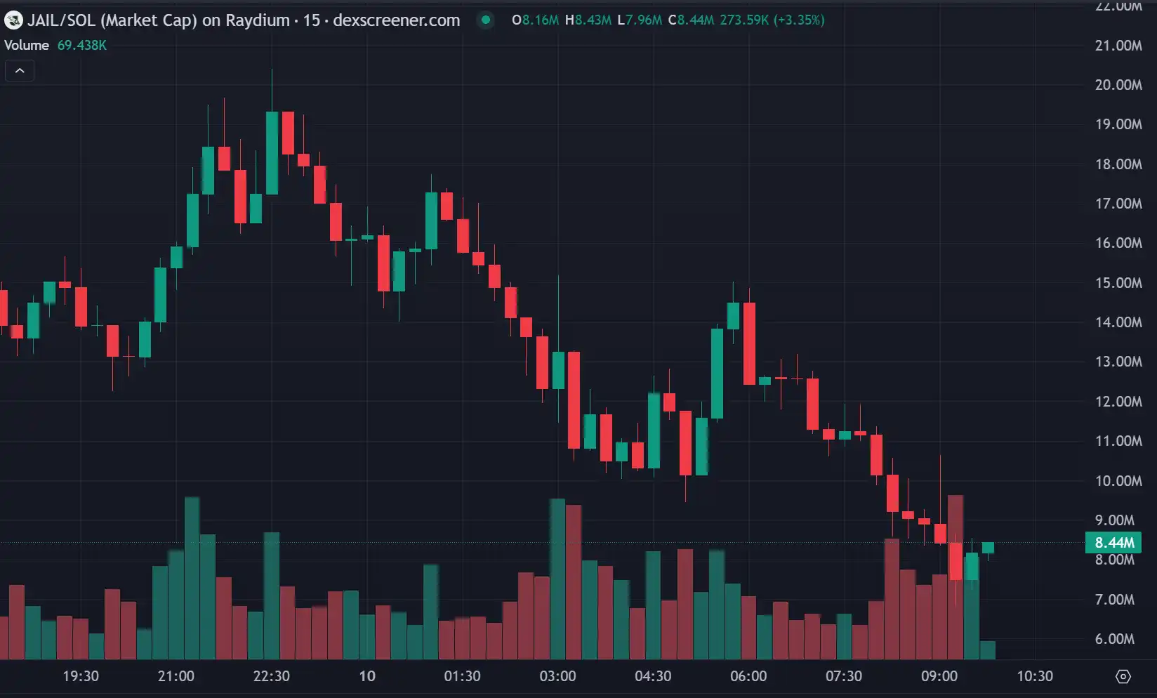 这个项目一开始周末上线时就很火,创建后 10 小时左右就上线 moonshot3 而且市值突破了两千万美元。上线不到一天,市值最高曾达到 20.92 百万美元,但现在回落到 8.37 百万美元。而且有意思的是,Jail 代币并没有受到大多数 VC 机构的关注,更多的是一级市场的 KOL 和社区关注这个项目,这个特点让网友们纷纷认为也它是更依赖社区的力量而成长起来的。