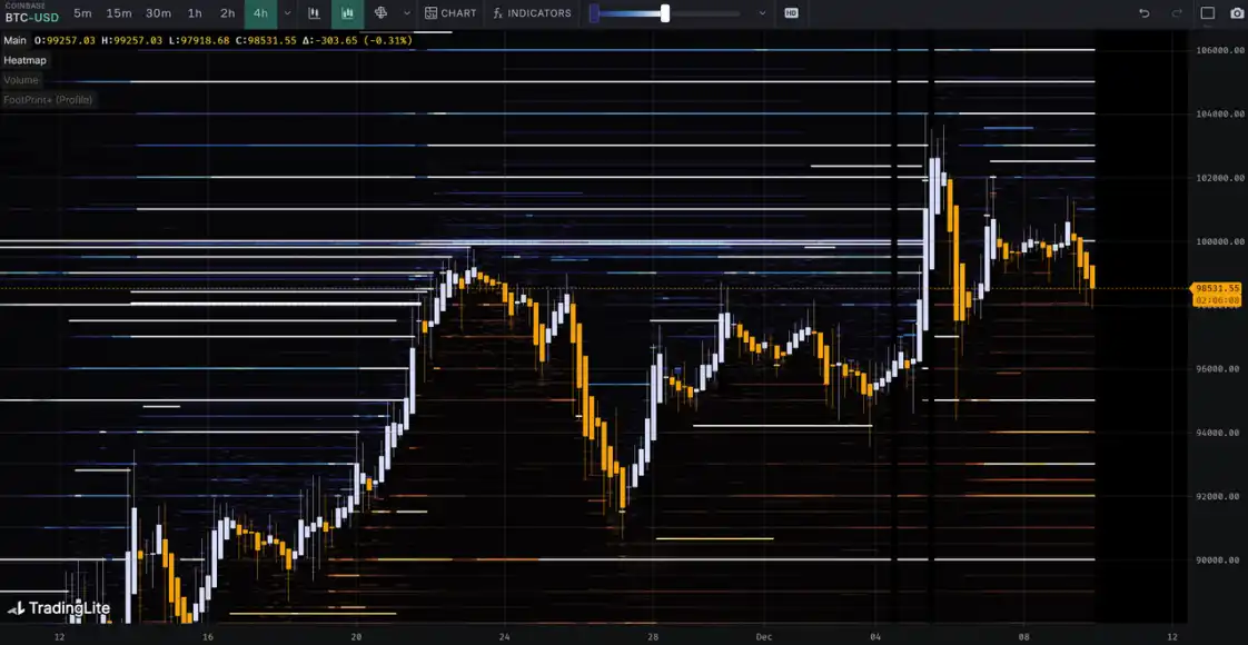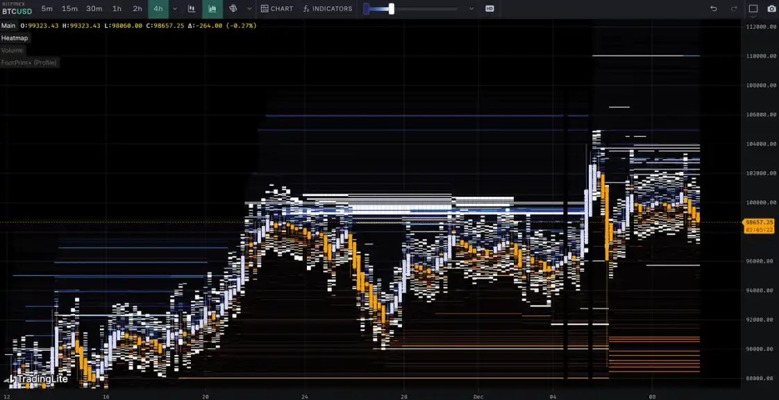 本周从 12⽉2⽇到 12⽉9⽇,冰糖橙最⾼附近$104088,最低接近$90500,震荡幅度达到 13% 左右。观察筹码分布图,在约 95000 附近有⼤量筹码成交,将有⼀定的⽀撑或压⼒。
