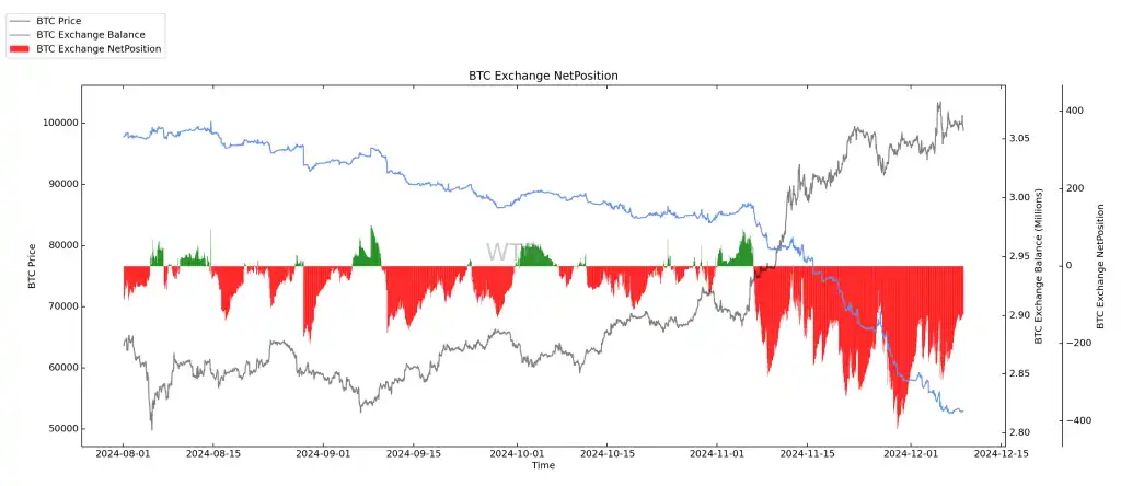BTC 交易所净头⼨持续性⼤量流出累积。