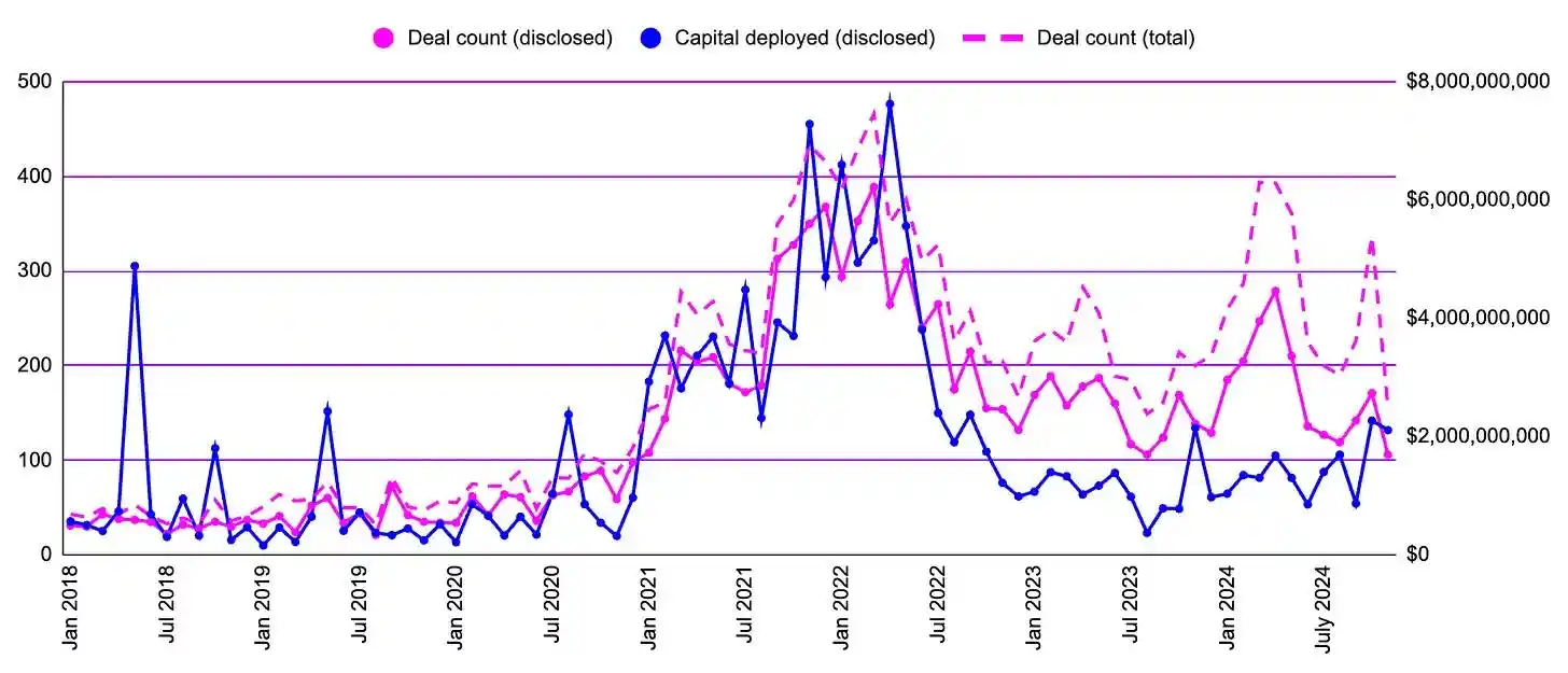 根据 Carta 的数据,11 月和 12 月实际上是全年交易量最多的月份,比其他大多数月份更加繁忙。然而,这种趋势并不适用于 Web3 领域。从我们掌握的数据来看,Web3 风投并没有表现出类似的年底集中完成交易的行为。具体到 2024 年 11 月的数据,我们并没有看到交易数量的显著增加。我会在未来文章中更详细地探讨这一点。