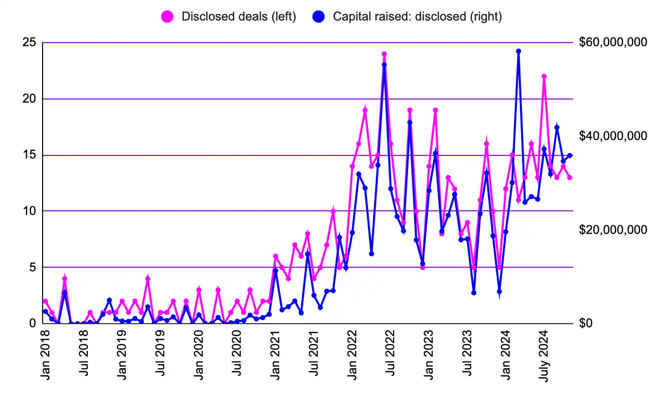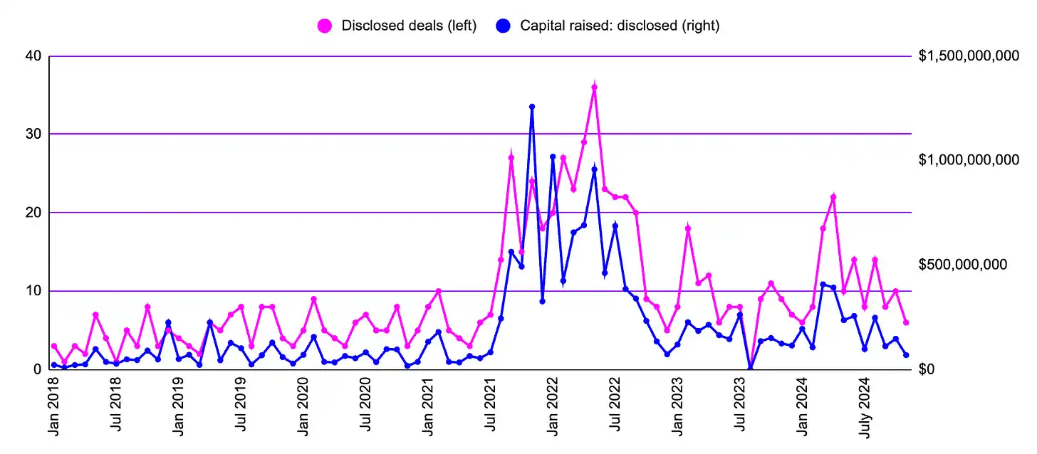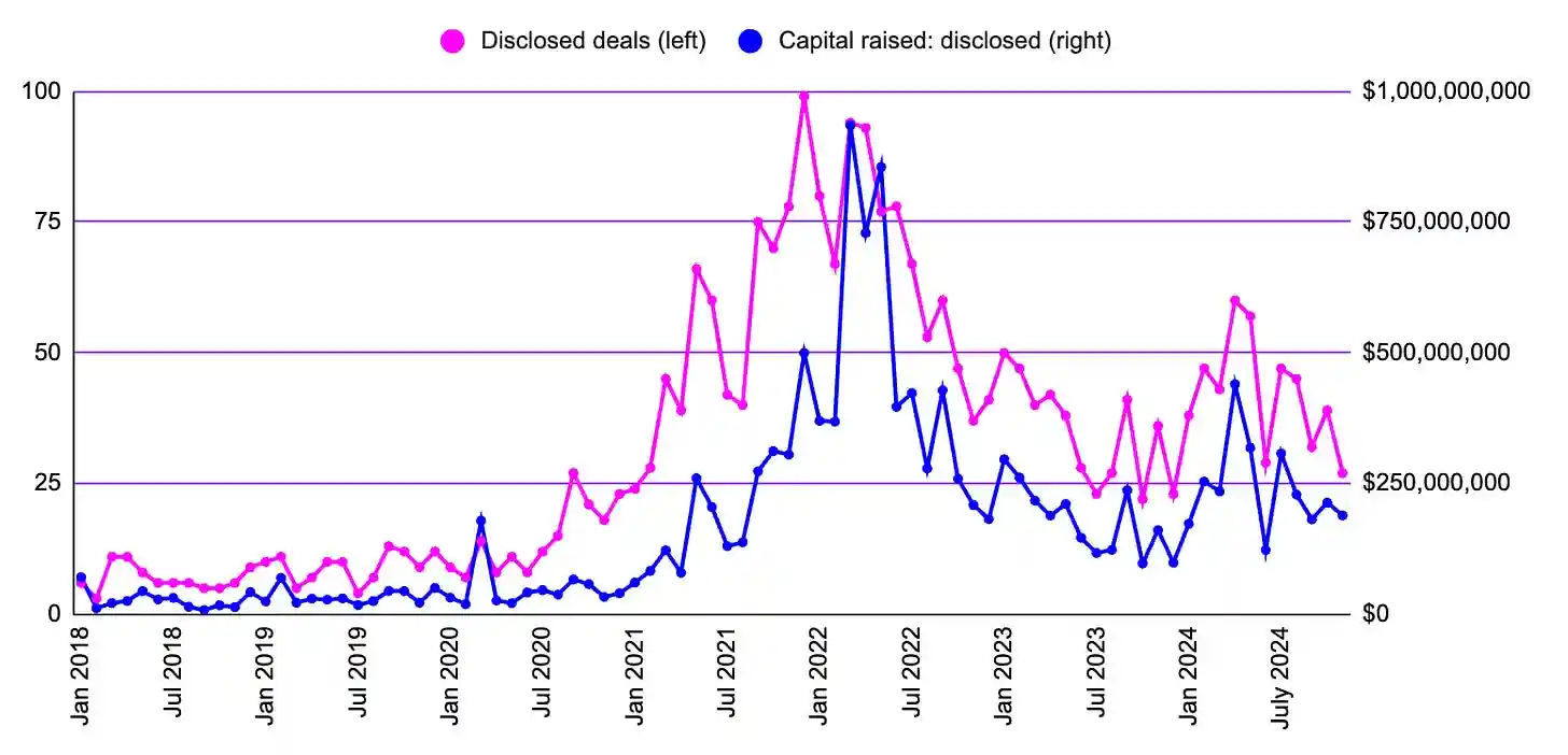 此外,2024 年 11 月的数据也表明,加密货币市场的波动对早期创业公司的融资没有直接的影响。正如之前几个月提到的,比特币 (BTC) 创下历史新高 (ATH) 后,风险投资资金的流入通常会有显著的延迟。2024 年 11 月的表现相对低迷,我预计到年底情况也不会有太大改善。