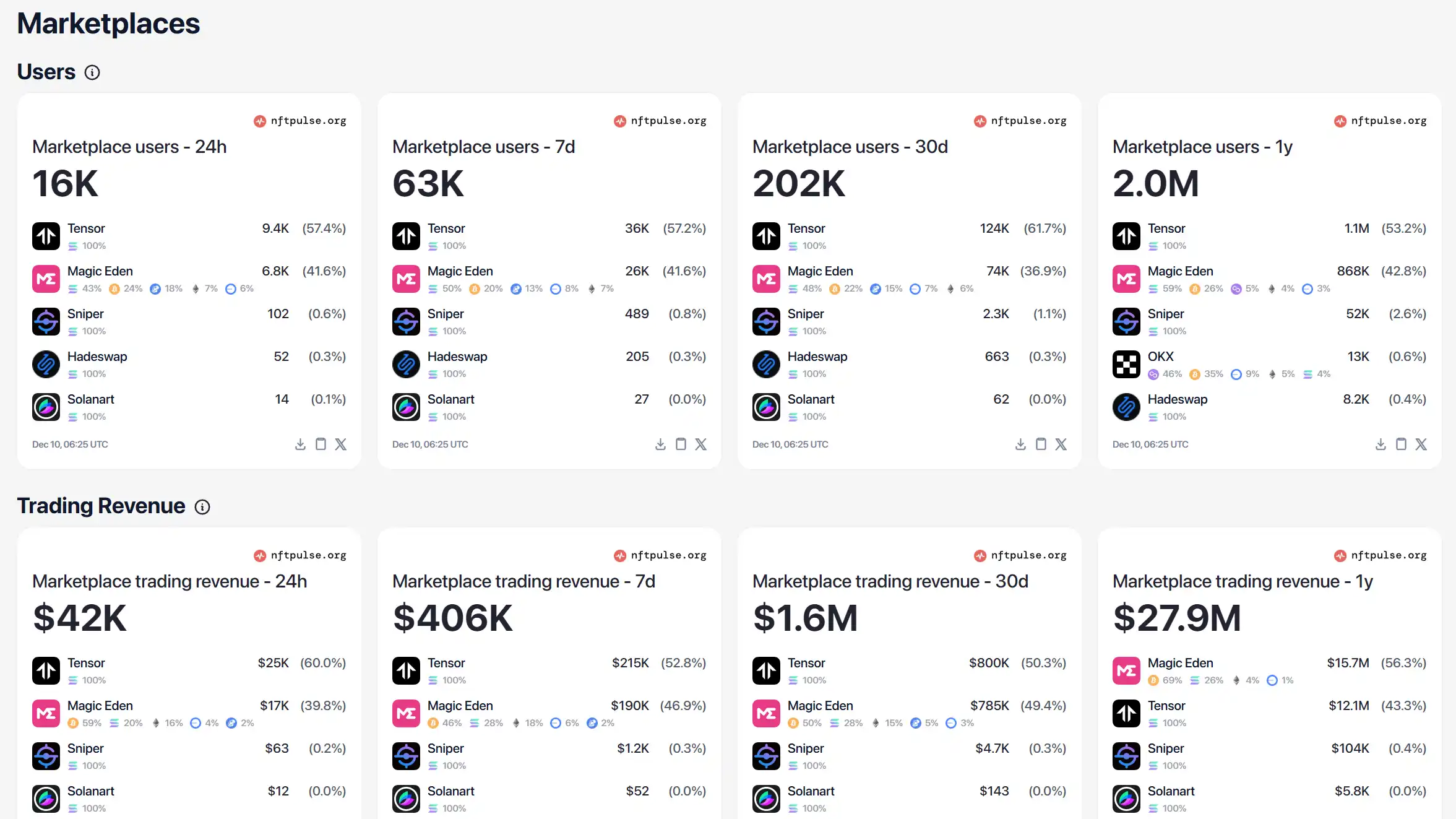 不过,从上面的用户数量与交易收入两个维度的统计数据看,Tensor 对 Magic Eden 其实都没有形成压倒性的领先。在 30 日期交易收入上,二者仅相差 15000 美元,可谓平分秋色。而在 1 年期交易收入上,Magic Eden 甚至还是要领先 Tensor 360 万美元的。
