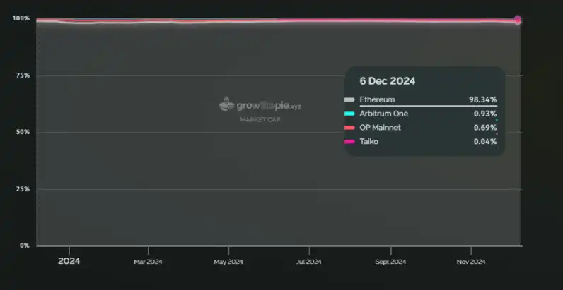 在收入方面,以太坊主网也是以太坊生态内最赚钱的一条链。近一年来,以太坊的收入占比始终保持在 80% 以上,截至 12 月 8 日,该数据为 92%。Base 链在今年开始成为收入第二高的以太坊生态链。