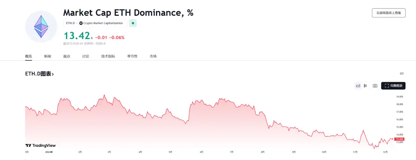 而以太坊的市值也始终保持在 98% 左右,尽管链上活跃度有所下降,但市值的占比似乎总体和 TVL 占比保持了高度一致。另外,从整个加密市场的占比来看,以太坊的市值占比确实在一年内不断下降,目前的比例仅为 13.4% 左右。