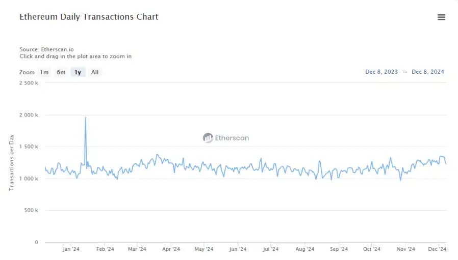 日均交易笔数是非常重要的活跃度指标,打开近一年以太坊日均交易笔数图表,能够看到一张像心电图一样稳中略有起伏的波动线。在 2023 年 12 月 8 日,以太坊主网的总交易量为 118 万笔,而经过一年的时间,2024 年 12 月 8 日,这一数据为 122 万笔,几乎持平。而在这一年间,仅有 2024 年 1 月曾短暂增长到 196 万笔。而其他的时间基本都维持在 100 万笔到 130 万笔之间。