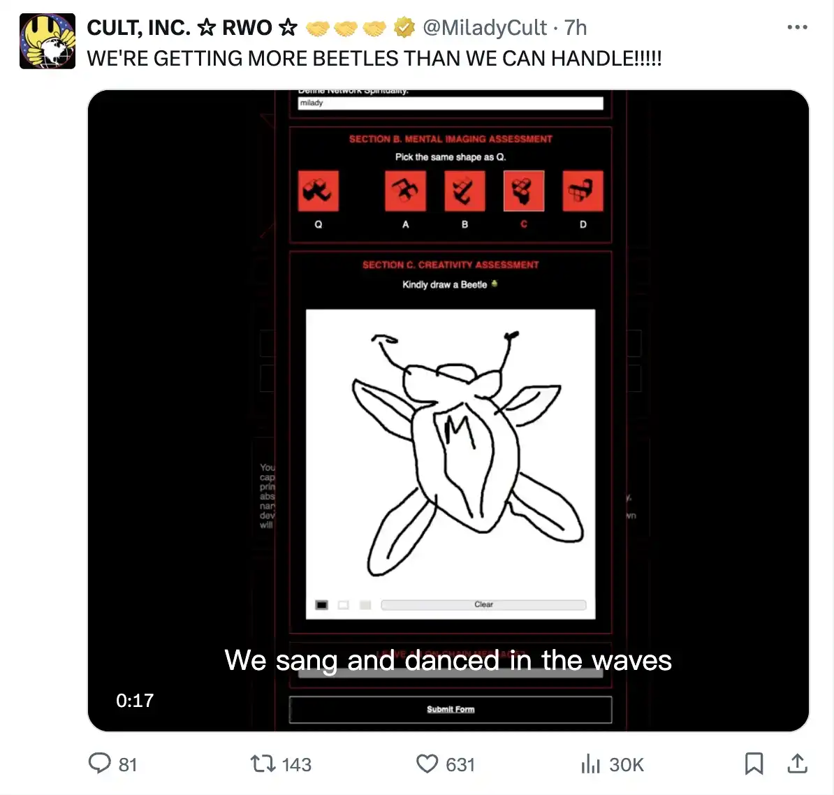 而根据 CULT 官方账号发布的信息来看,参与 CULT 代币申领的用户画出来的甲壳虫也千奇百怪,颇具 Meme 属性,甚至说「极为抽象」也不为过。