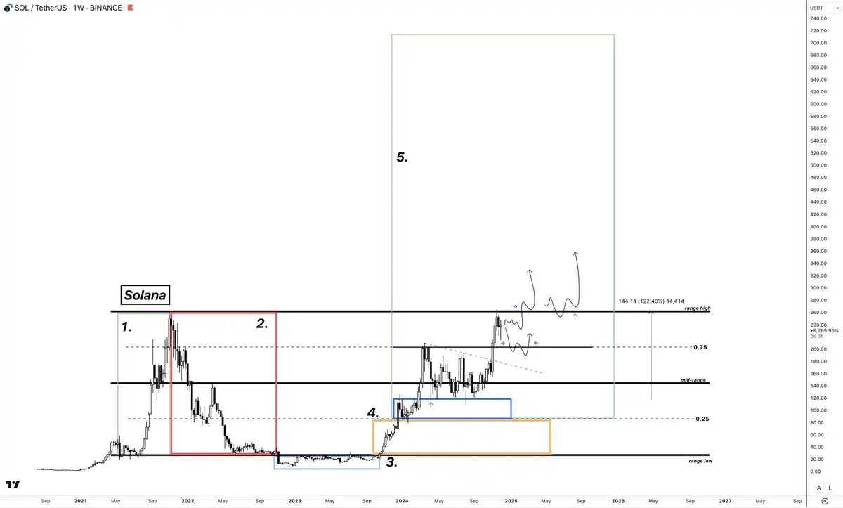从市场周期的角度看,我预计 SOL 会突破当前的区间高位,并在价格进入「发现阶段」(即价格达到历史新高后,市场探索其真实价值)时有明显的上涨潜力。