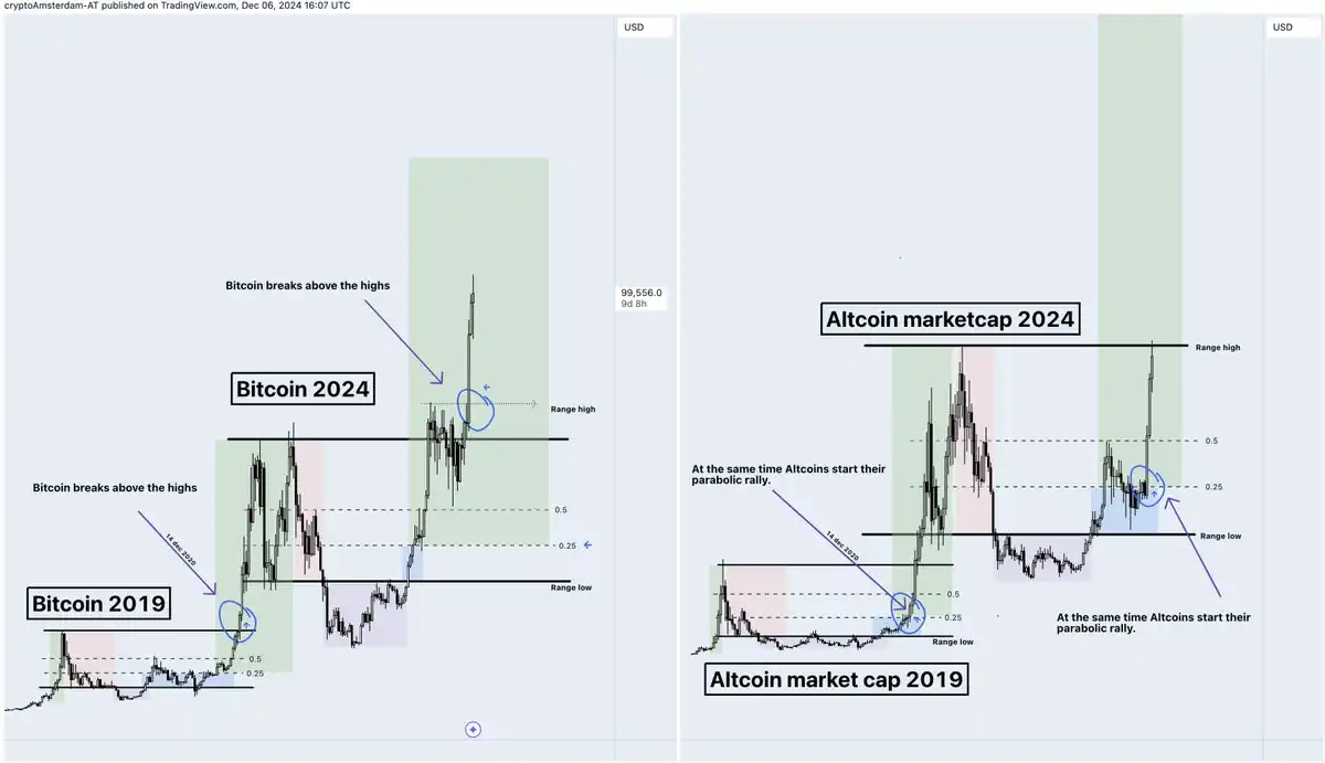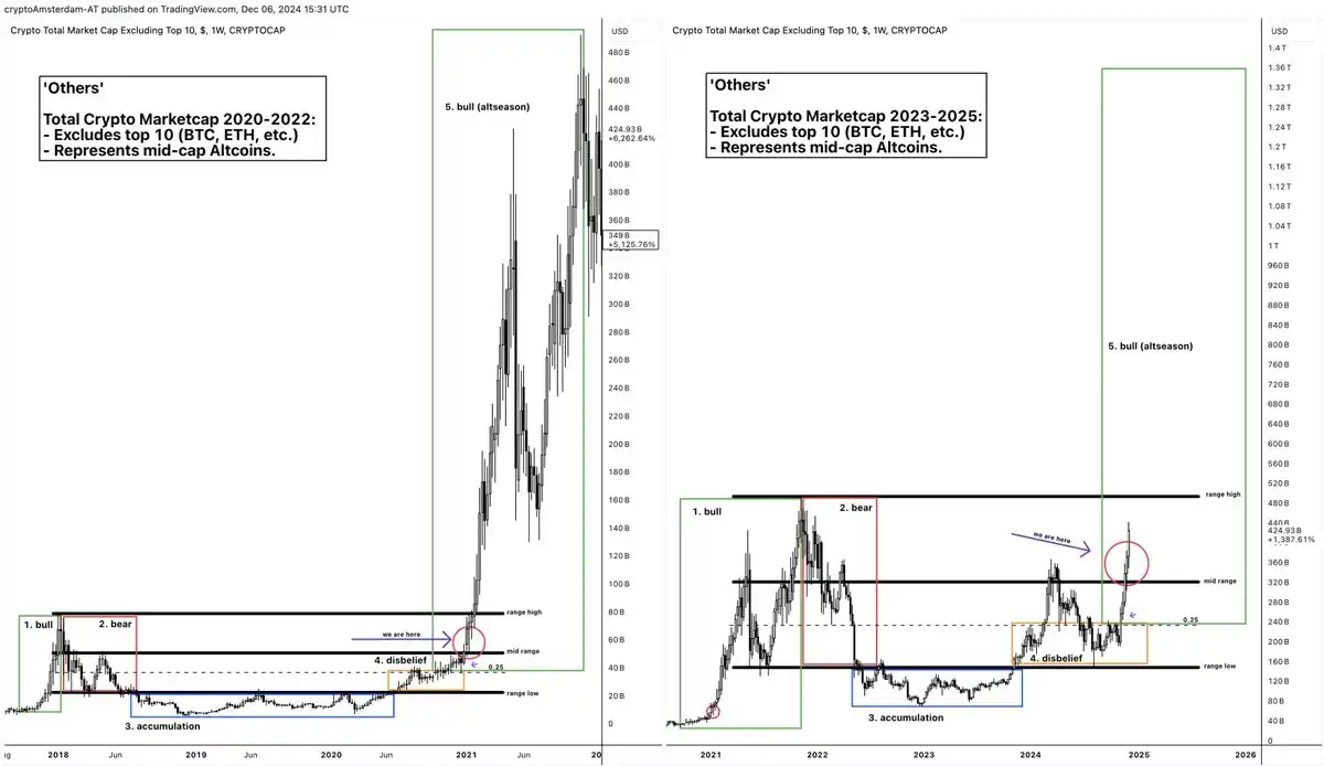 · 阶段 2:比特币突破历史新高,山寨币开始进入快速上涨阶段。