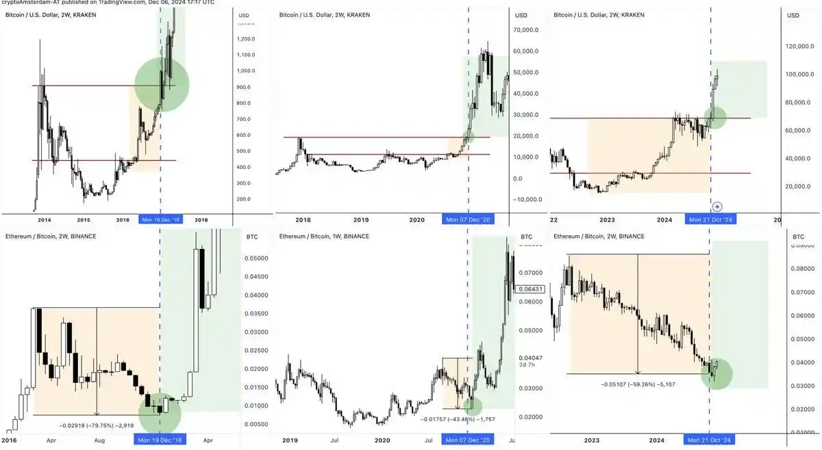 每个周期,以太坊在早期都会表现疲软(比特币上涨但仍低于前高),随后在比特币站稳前高上方时开始反弹。