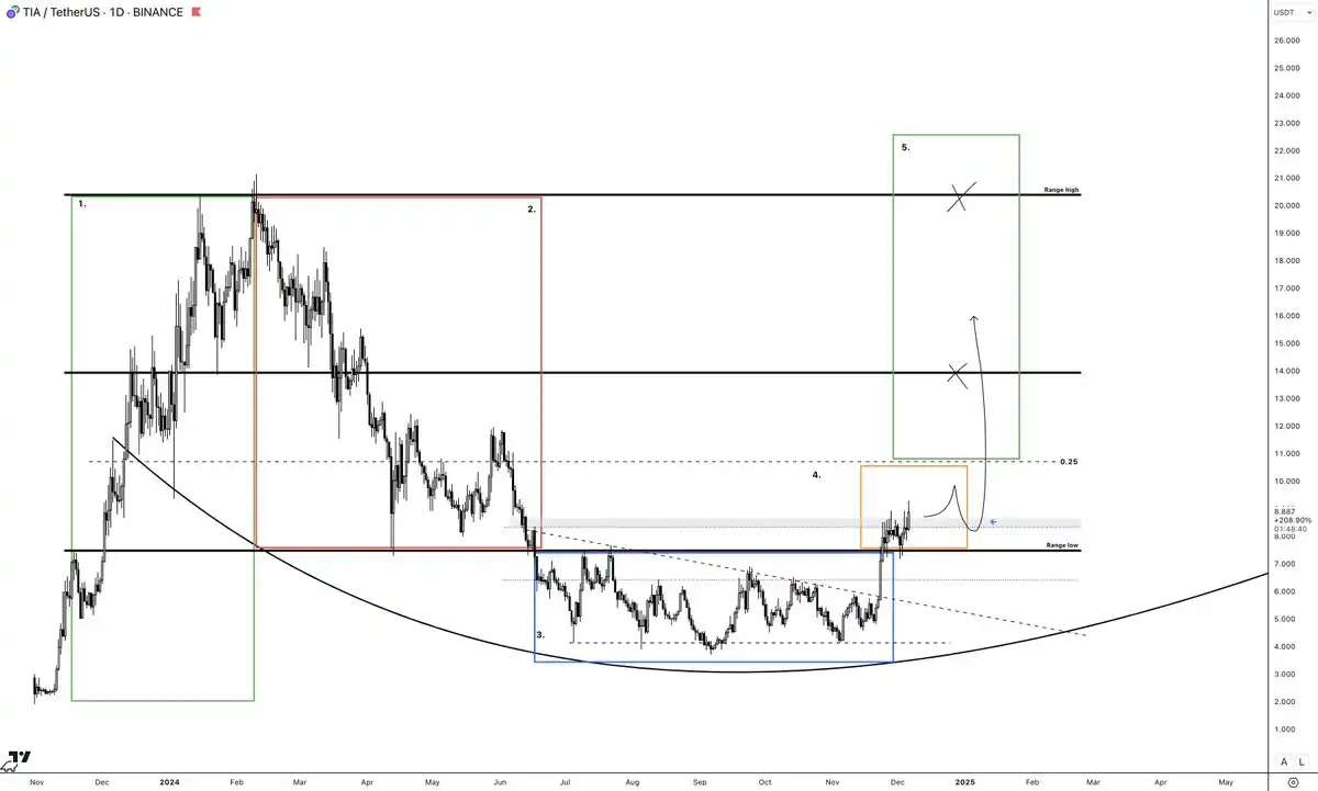 $ORAI 是一个元老级的 AI 代币。上周,它在短周期市场结构中成功收复了阶段 4(橙色区域),因此我再次买入了一些仓位。