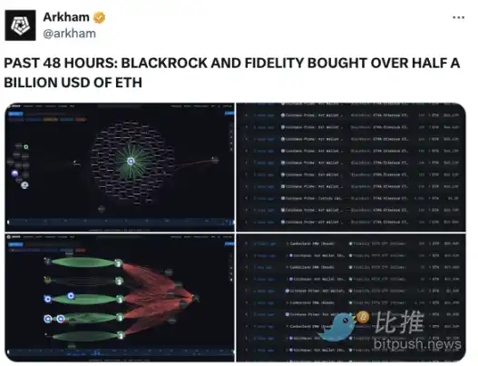 Sosovalue 的数据显示,机构投资者抓住机会正在逢低买入,12 月 10 日,流入美国现货比特币 ETF 的资金为 4.395 亿美元。美国现货以太币 ETF 创下有史以来第三大日流入量,达 3.057 亿美元。Arkham 监测数据显示,过去 48 小时内,贝莱德和富达 ETF 购买了价值超过 5 亿美元的 ETH。