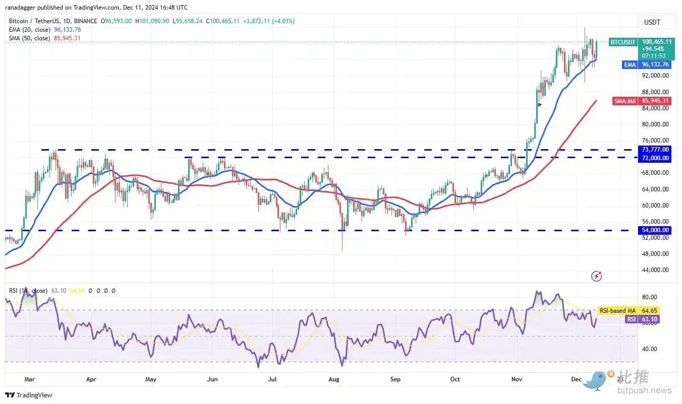 图表分析师 Upadhyay 认为,比特币价格从 20 日均线(约 96,133 美元)处强势反弹,显示出多头力量依然强劲。若能有效突破 101,351 美元至 104,088 美元的阻力区间,将进一步确认上涨趋势。届时,比特币有望冲击 113,331 美元,甚至挑战 125,000 美元关口。