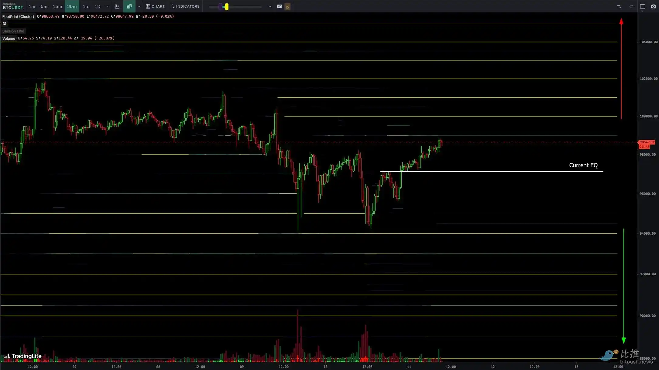 知名交易员 Skew 指出,目前市场处于供需平衡状态,并强调有「被动买家」在支撑价格。此外,他也提到,在全球最大的加密货币交易所 Binance 上,97,000 美元左右存在较强的买盘和卖盘。