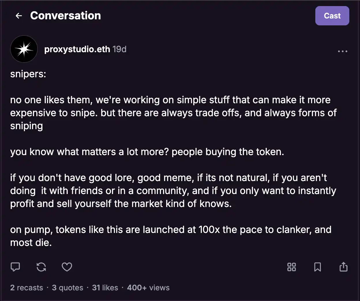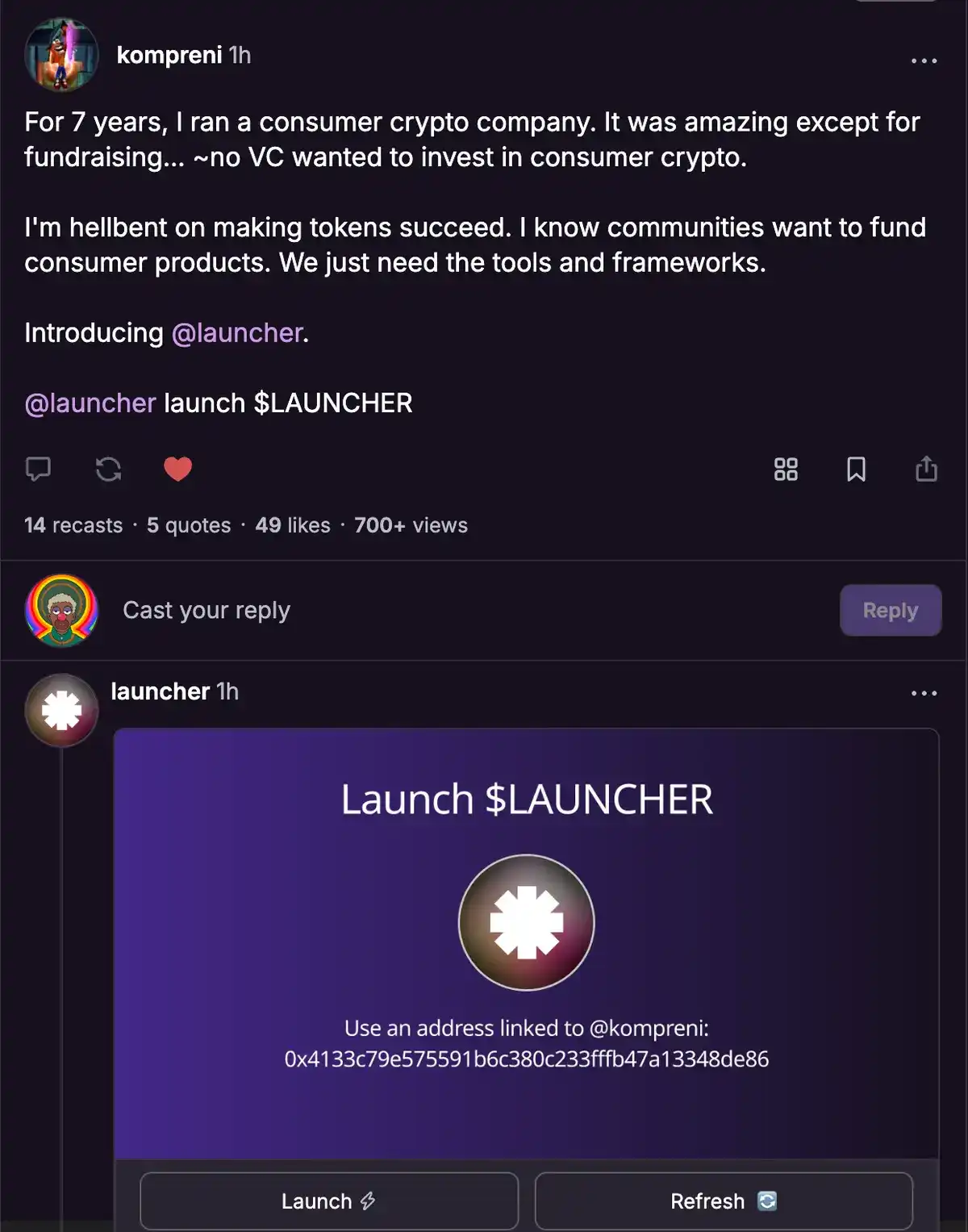 这使得创作者/社区能够在抢购者之前确保代币,但在达到这一基准之前,代币的可见性是有限的。Dreamboy 是代币启动器,但我不确定它是否已在 Farcaster 上线。