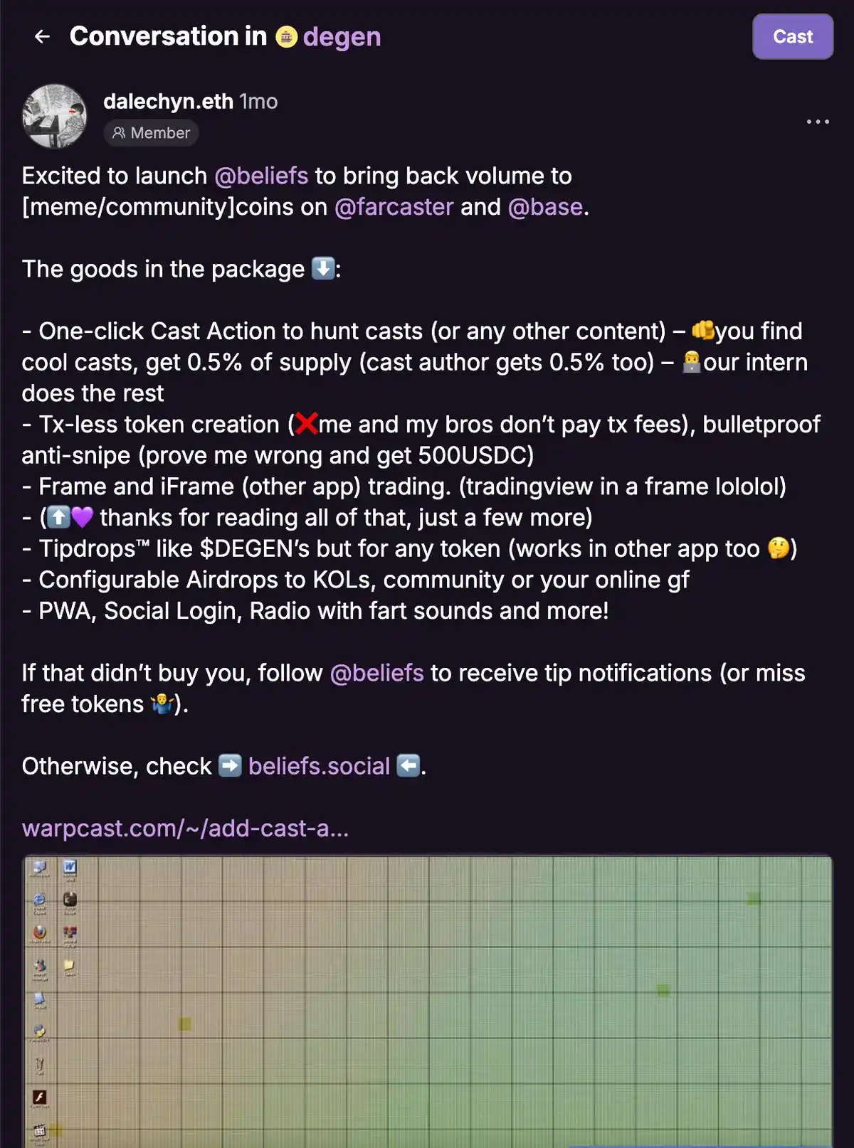 Beliefs 最初是由 dalechyn 和 kienfam 构建的 Farcaster 原生机器人代币启动器。然而,目前他们已转向专注于 X 和 Telegram,并承诺很快会回来。