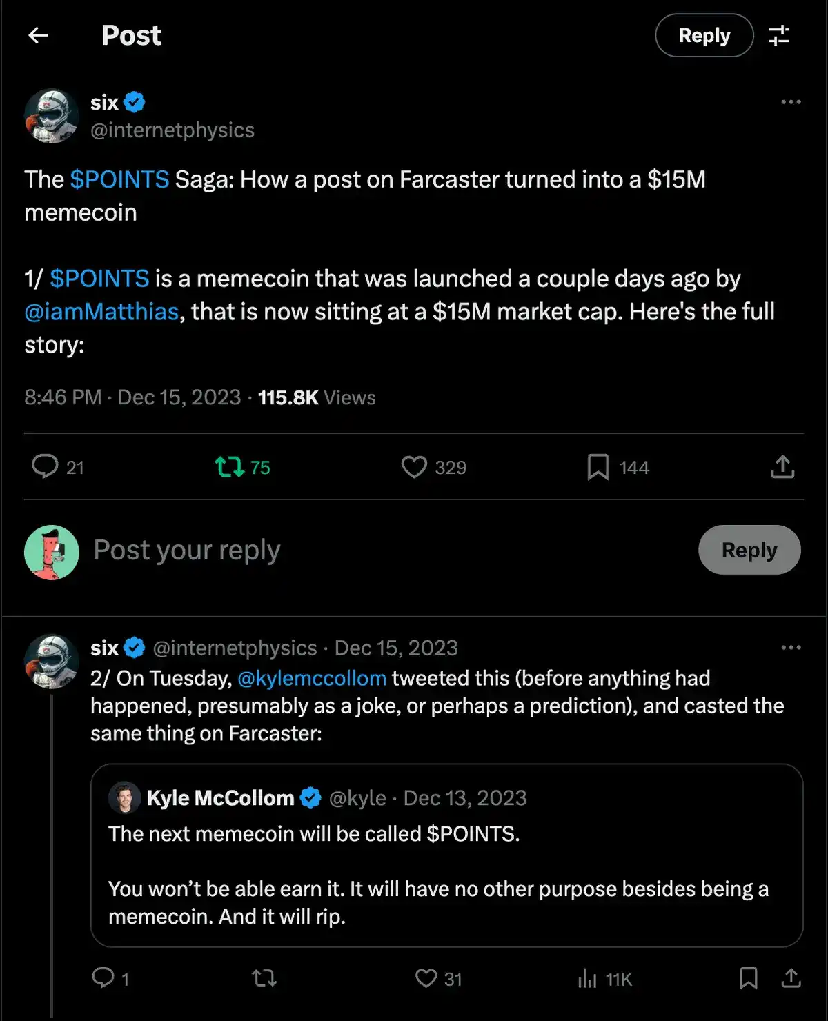 Farcaster 上的代币化的第一阶段始于 POINTS,由 iammatthias 在社区的轻微推动下作为一个玩笑推出,Six 写了一篇关于它的精彩帖子。