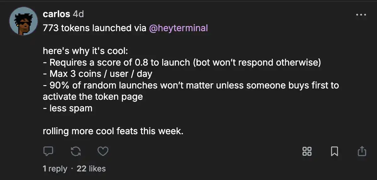 Carlos 开发了 Heyterminal,这是一款嵌入社交动态的机器人,能够支持代币发行。我还没有亲自使用过,但它运行良好,所有相关代币可以在 Heyterminal 的网页上查看。