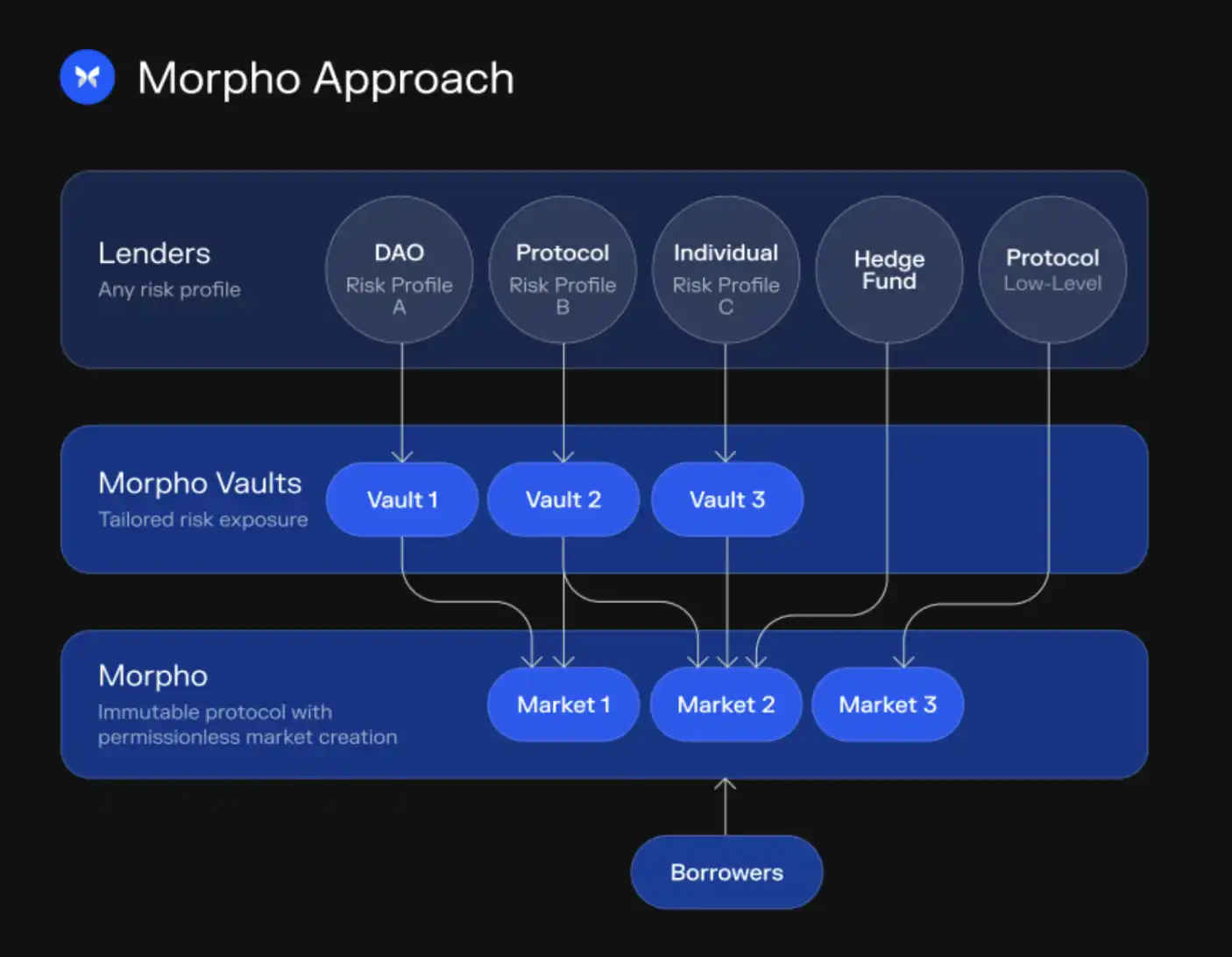 2. Morpho 的运作以 Aave 和 Compound 为依托,利用它们的基础设施作为资金缓冲池,从而将风险控制在与这些成熟协议相近的水平。