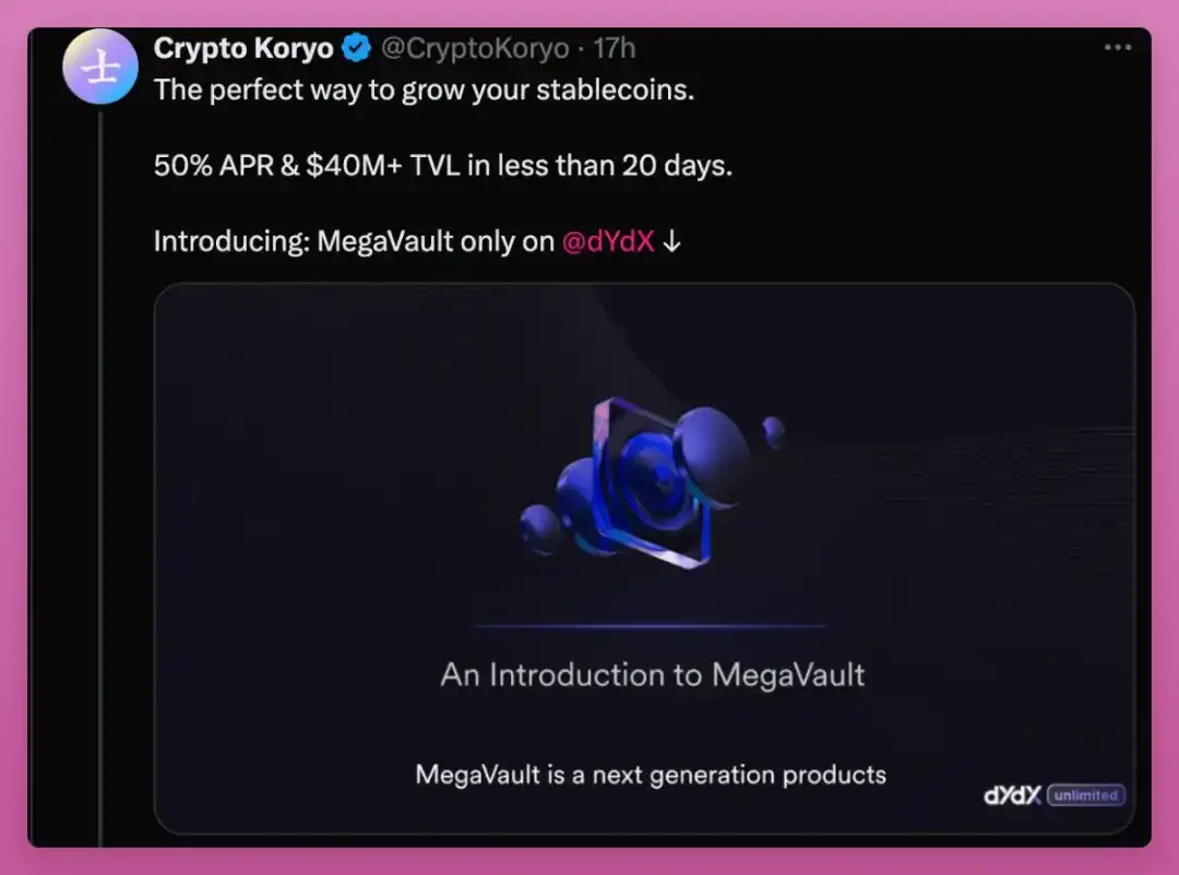 交易奖励每月分发 150 万美元的 DYDX 代币,并为 MegaVault 存款者提供高达 100,000 USDC 的奖池。自此,dYdX 取得了一些不错的成绩,TVL 超过 4,000 万美元,APY 达到 51%。