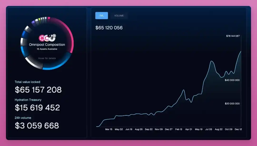 Hydration 正在崛起,自 10 月份以来活跃用户增加了 50%,费用也达到了历史最高水平的两倍。如果你来自 ETH 或 Solana DeFi,你可能会喜欢 Hydration。它将交易、借贷和稳定币整合到一个应用链中。其 Omnipool 简化了流动性并支持单边存款,TVL 达到 6800 多万美元。Hydration 的稳定币 2 池 (USDT-USDC) 提供高达 36% 的年利率和 vDOT 奖励。