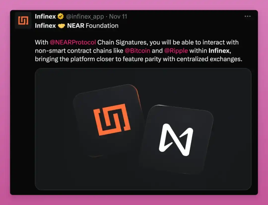 除此之外,NEAR Intents(意图)还引入了一种新的交易模型,可实现 AI 代理、服务和用户之间的跨链结算。我个人认为,最酷的是 Infinex 和 NEAR 之间的合作,你可以在一个去中心化平台上交易 BTC、XRP 或其他任何东西。