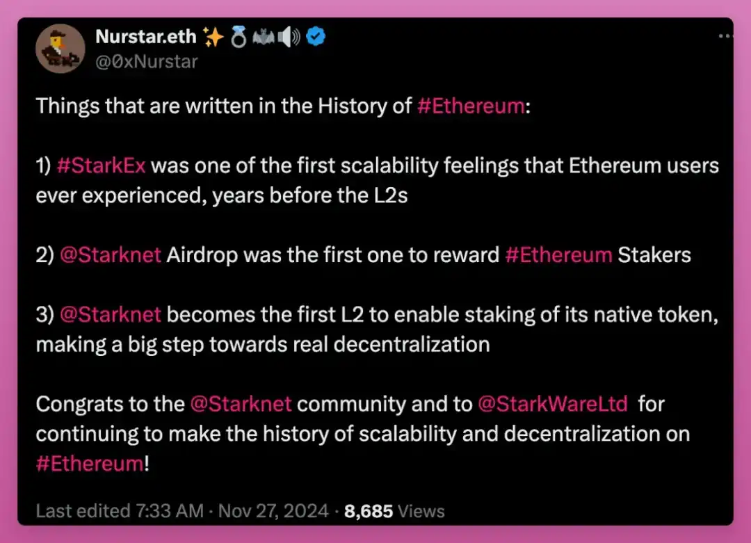 STRK 空投遭遇了 FUD,但不可否认的是,Starknet 最近取得了重大进展。他们正在突破 L2 技的术界限,值得关注。