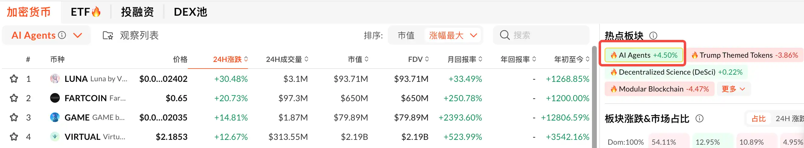 头部代币如 ai16z 和 Fartcoin 一路上涨,而尾部一天你甚至能看到几百个自称 AI Agent 的代币同时出现在监控列表中。