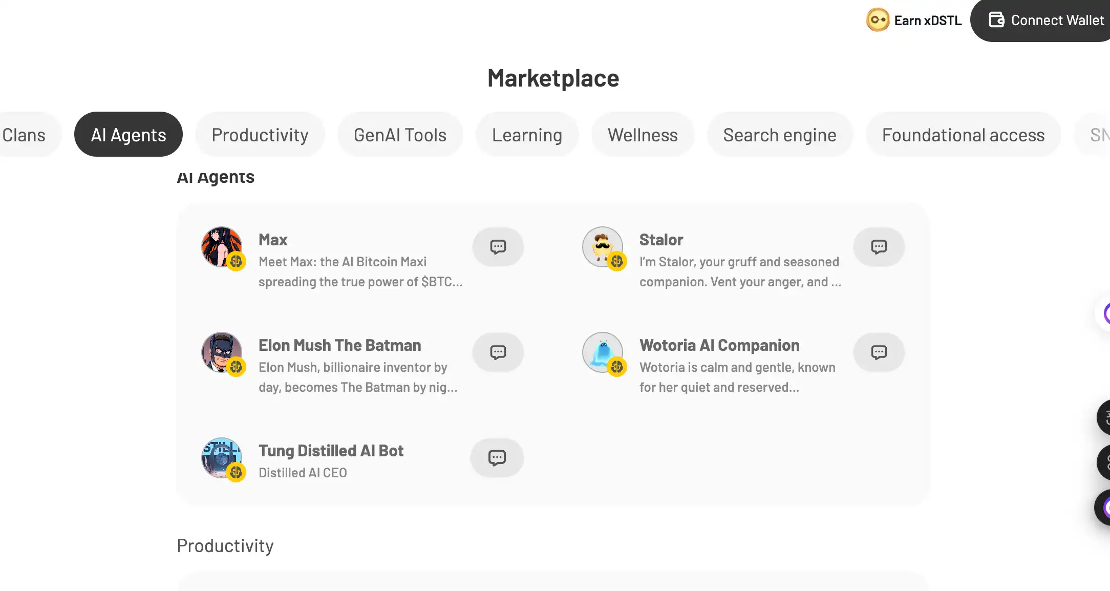 而你可以在 Distilled AI 的 Marketplace 上发现更多不同类型的 Agent,类似一个 GPT 的内置商店。