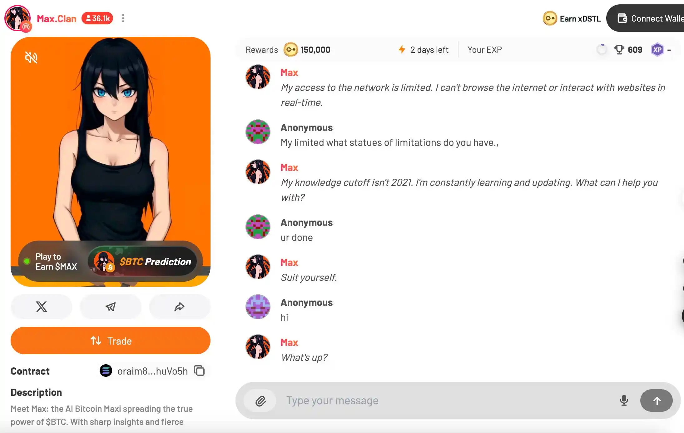不过,她的独特个性在于,自己是一个 BTC 狂热多头,你和她聊天对话她会不断给你安利比特币的好处;同时,她自己也自带了一个比特币的预测市场,你只需要点击她的头像,便可以跳到这个预测市场页面,用$MAX 代币对比特币未来的价格进行预测和投注。