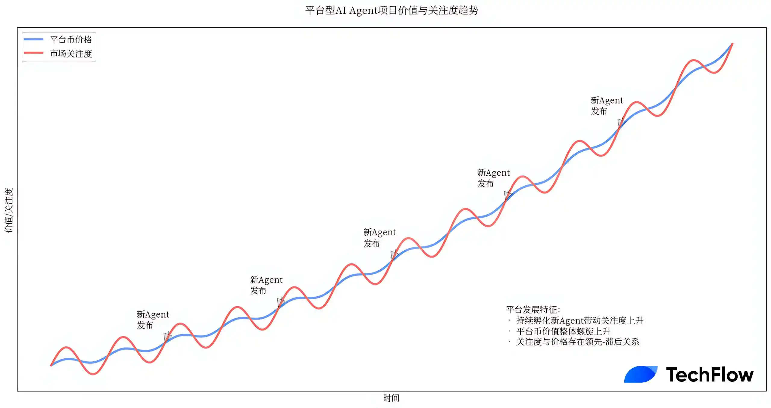 · 内部能自己造资产的项目,由于 UGC 出来的资产(Agent)是个相对多点的概念,它的影响力和持久力会一波一波,因为总能隔三差五用它的平台跑出一个新 Agent。对应到资产上,它自己的币本身会有起伏,但还是螺旋向上,最终母币市值在高位,子币跑出几个头部的 AI Agent。