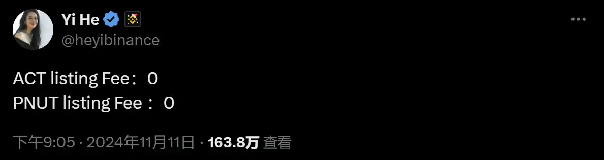 在本着去中心化精神为主的 Crypto 世界里,中心化的 CEX 成为了主要的参与主体。然而 CEX 上币的黑箱操作却很难让市场买单,每隔一段时间都有关于 CEX 上币的「谣言」流传。Binance 的创始人何一曾在上币 PNUT 和 ACT 之后表示「未收取任何的上币费」,强如 Binance 也需要通过上币这件事本身来脱离「上币费」的舆论漩涡。