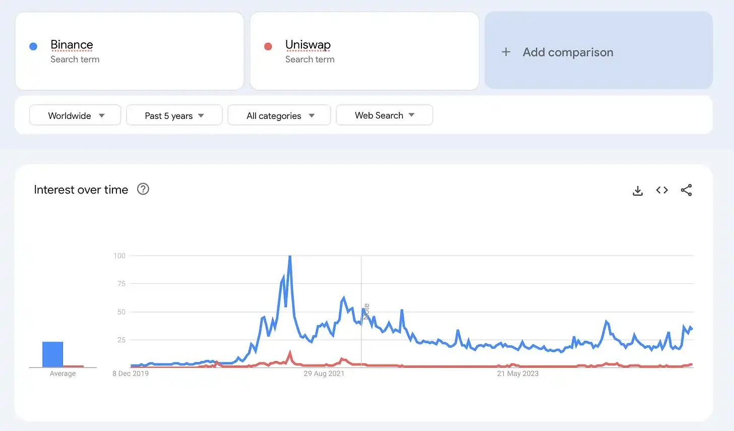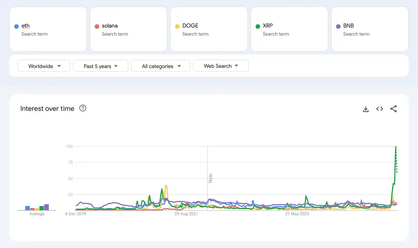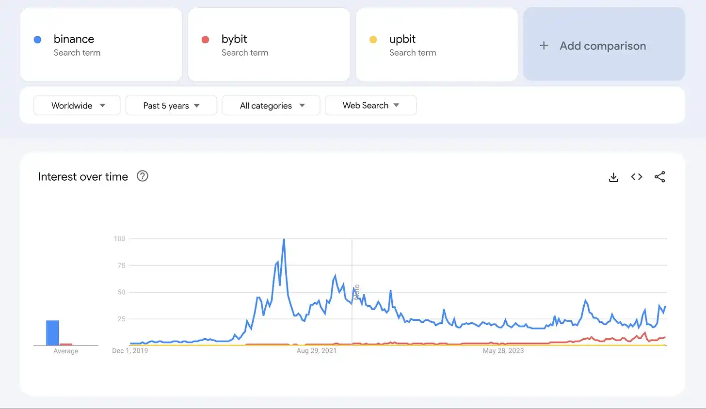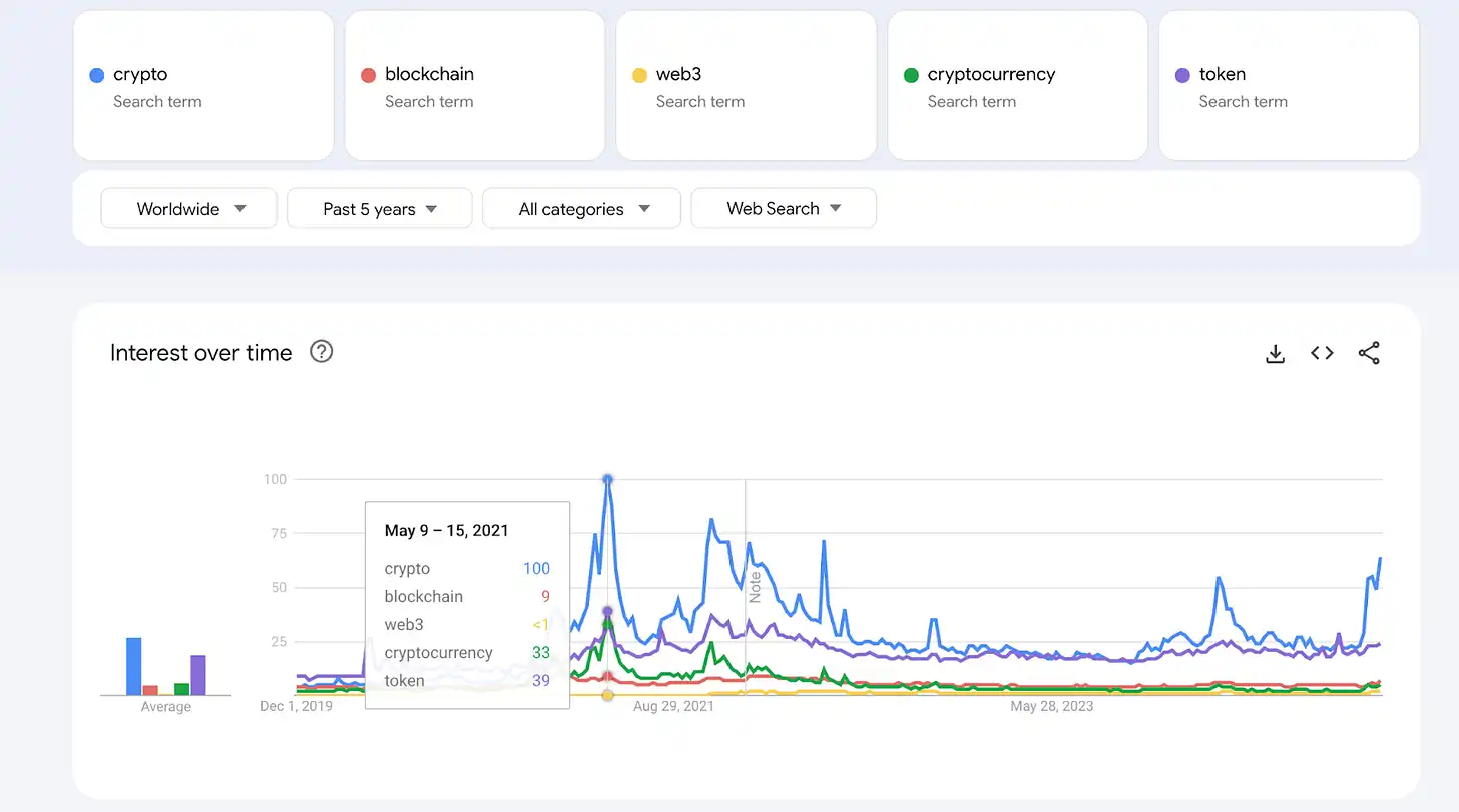 为了更好地理解用户兴趣的变化,我分析了过去五年的 Google Trends。这一时期覆盖了牛市和熊市市场周期,提供了一个客观视角。