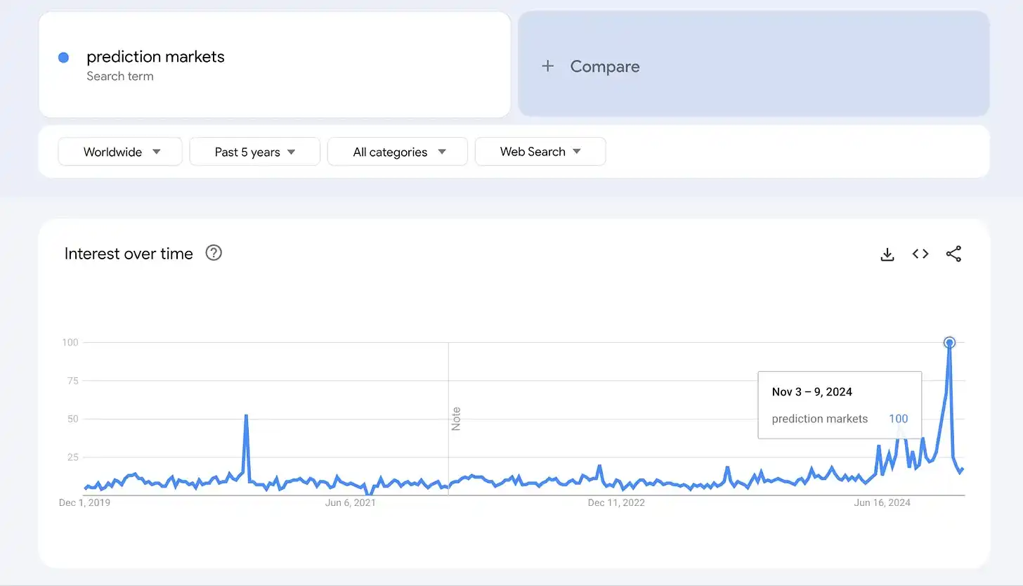 · 在 Polymarket 上特朗普相关讨论的推动下,预测市场在 2024 年 11 月飙升。然而,热度迅速下降,反映出与 2020 年 11 月类似的趋势。