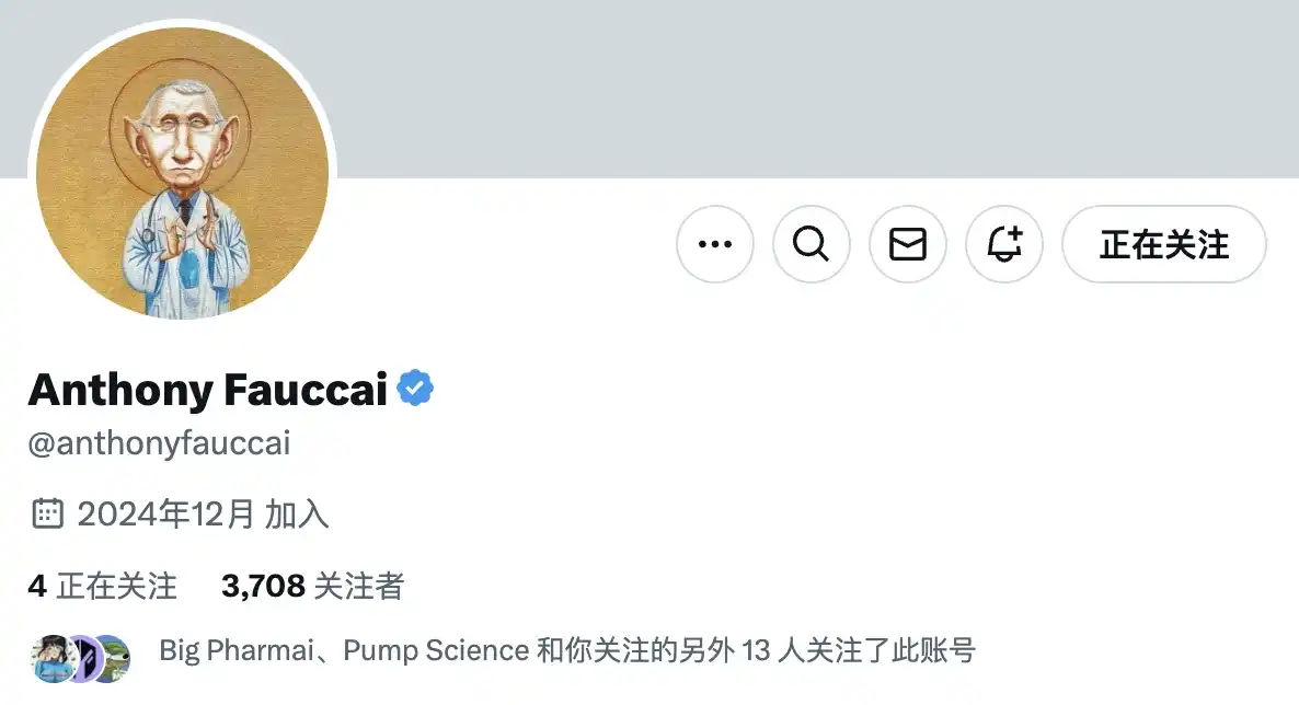 Big Pharmai 的 meme 叙事点在于医疗及制药,其愿景为颠覆「Big Pharma」,即那些在全球范围内具有显著影响力和市场份额的大型制药企业。Big Pharmai 发起人的 X 账户名为 Anthony Fauccai(@anthonyfauccai),显然也是在模仿疫情期间大火的知名流行病学家安东尼·福奇(Anthony Fauci)。