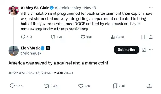 特朗普赢得选举后,PNUT 作为 Meme 已然成为美国自由民主与平权的文化符号,赢得了一场 Meme 文化的胜利。马斯克在大选后发推称「美国是被一只松鼠和 Meme 币拯救的。