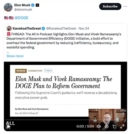 2024 年 11 月 12 日,唐纳德·特朗普宣布成立「政府效率部」(Department of Government Efficiency) 简称 D.O.G.E.,并任命埃隆·马斯克(Elon Musk)和维韦克·拉马斯瓦米(Vivek Ramaswamy)共同领导该部门。特朗普对其期待相当高,他表示:它可能会成为我们时代的「曼哈顿计划」,将为其政府铺平道路,以拆除政府官僚机构,削减多余的监管,减少浪费性开支,并重组联邦机构——这对于『拯救美国』运动至关重要。