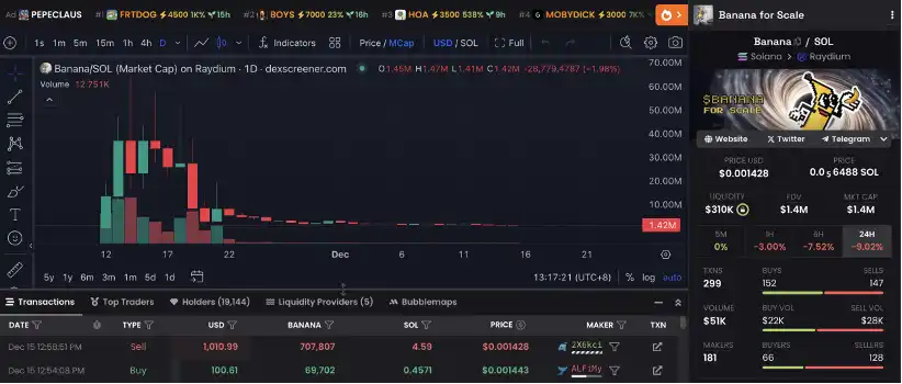 S31 星舰的科技里程碑和幽默的网络梗,让很多 Meme 币有了炒作角度,11 月中有大量关于香蕉,星舰的代币在各链发射,但本次最终跑出的代币不是来自传统 Meme 热点链的 SOL 和 ETH,而来自沉寂多年的 BSC 链。ETH 链的标的均没有很好的价格表现,SOL 链的 BANANA 出现了 为期一周的炒作高光时刻,最高市值达到 6500w 左右,但当前已近似 Rug,令人意外的是 BSC 链的 BANANAS31 生命周期至今已接近一个月,最高市值达到 8000w,当前稳定在 5000w 左右的市值,过往 SpaceX 概念标的生命周期一般为几天时间。而 BANANAS31 同时具有强大的社区在当前还在持续做事,用自己的理解去传播科技与文化 Meme,近日举行「Banana for Scale」Tiktok 挑战赛,甚至进行了 web2 破圈传播。或许该标的或许有潜力成为马斯克与 SpaceX 概念中第一个科技与文化概念融合的常青 Meme。
