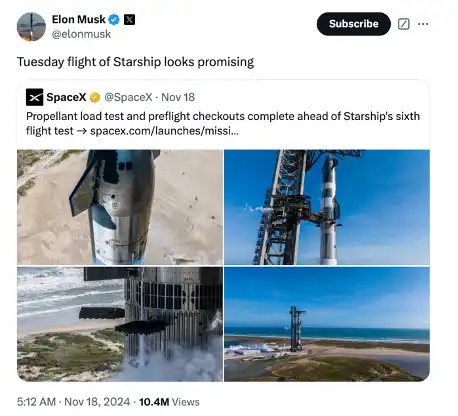 关于 SpaceX 的 Meme 已成为加密行业捕捉和炒作的热点,但此概念的标的大多生命周期较短,直到近期 BANANAS31 的出现,或许有潜力成为第一个科技与文化概念融合的常青 Meme。2024 年 11 月 20 日凌晨 6 时,SpaceX 在德克萨斯州博卡奇卡的发射基地成功进行了星舰 S31 的第六次综合测试飞行。S31 是初代星舰系列的最后一次飞行测试,标志着 SpaceX 将全面转向第二代星舰(Starship V2)的开发。这让 S31 成为整个星舰开发历史中的关键节点。最终的的成功飞行为 SpaceX 挽回了在之前几次失败任务后受到的质疑,展示了星舰系统的逐步成熟,也为其后续的载人任务奠定了信心。S31 是马斯克与 SpaceX 初代星舰的「谢幕任务」和下个宇宙探索计划的开端。