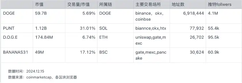 从市值数据的横向对比中,BANANAS31 市值最小,PNUT 市值是其 22 倍,D.O.G.E 是其 3.5 倍;交易量与市值之比上,BANANAS31 近期仅次于 PNUT,是 D.O.G.E 的 2.5 倍;社交媒体数据与 PNUT,D.O.G.E 数据相差不大(鉴于推特数据会有一定程度水分,50k-1m 之间视为趋同);持仓地址数,优于 D.O.G.E.。