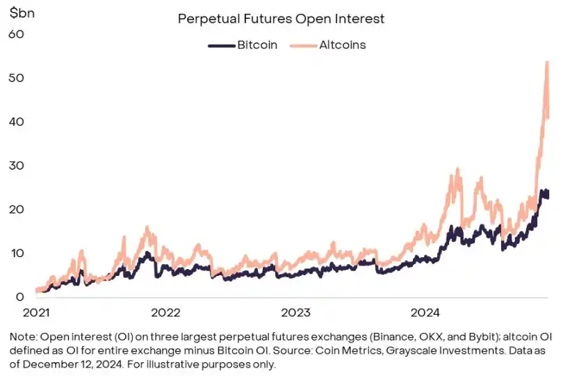 相比之下,山寨币的永续期货未平仓合约 (OI) 已达到相对较高的水平。在 12 月 9 日发生重大清算事件之前,三大永续期货交易所的山寨币未平仓合约已达到近 540 亿美元(图表 9)。这表明整个大盘投机交易者持仓量相对较高。在大规模清算后,山寨币未平仓合约下跌了约 100 亿美元,但仍处于高位。投机交易者多头仓位较高可能与市场周期的后期阶段一致,因此继续监测这一指标可能很重要。