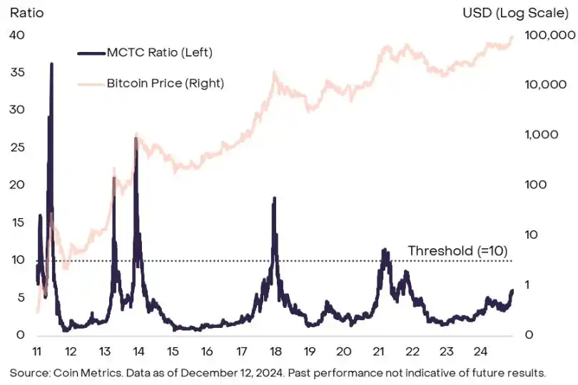 一些周期性指标则侧重于比特币矿工,即保护比特币网络的专业服务提供商。例如,一种常见的衡量标准是计算矿工持仓 (MC)(矿工持有的所有比特币的美元价值)与所谓的「thermocap」(TC)(通过区块奖励和交易费向矿工发放的比特币的累计价值)的比率。通常而言,当矿工资产的价值达到某个阈值时,他们可能会开始获利。从历史上看,当 MCTC 比率超过 10 时,价格随后会在该周期内达到峰值(图表 6)。目前,MCTC 比率约为 6,表明我们仍处于当前周期的中间阶段。然而,与 MVRV 比率类似,该指标在最近周期中峰值正在不断下降,所以价格峰值可能在 MCTC 比率达到 10 之前到来。