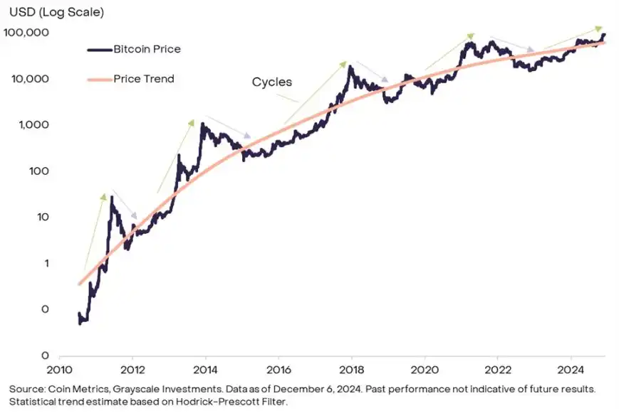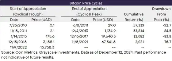 · Grayscale Research 认为当前市场正处于新一轮加密周期的中期阶段。只要基本面(如应用采用和宏观市场条件)可靠,牛市就有可能延续到 2025 年甚至更久。