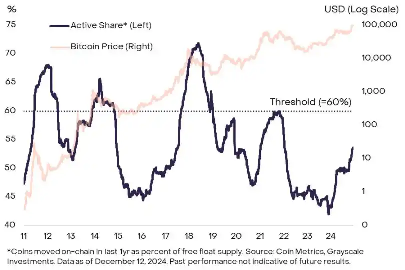 图 5:过去一年活跃的比特币与流通量的比率不到 60%