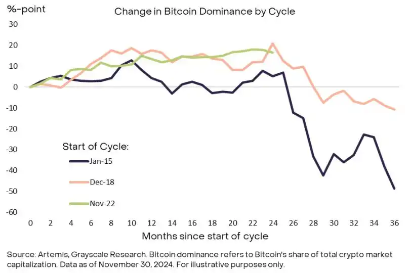 图 7:过去两个周期中,比特币的主导地位在的第三年呈下降趋势