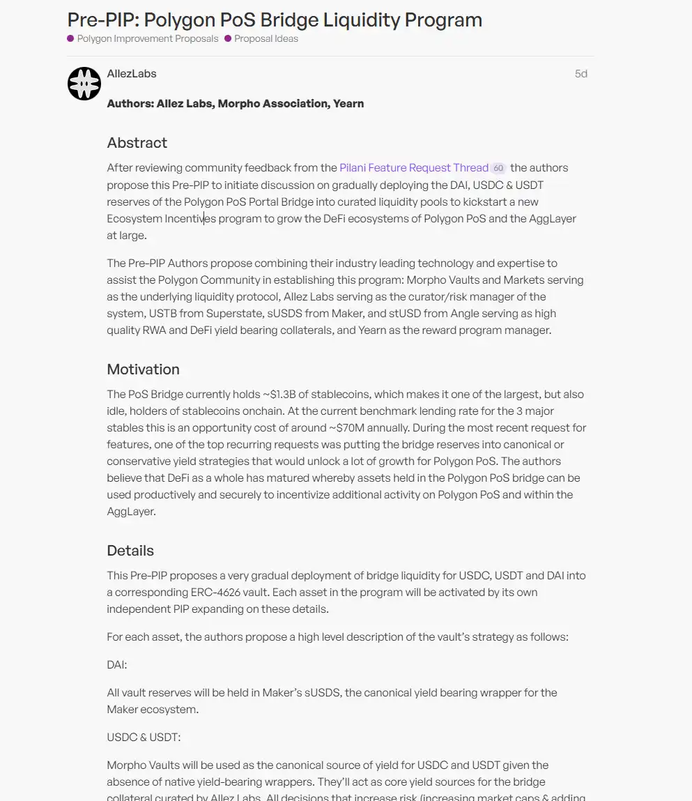 据了解,Polygon PoS 桥接中持有约 13 亿美元的稳定币储备,社区建议将这些闲置资金部署到经过精心挑选的流动性池中,以产生收益并促进 Polygon 生态系统的发展。根据当前的贷款利率,这些资金每年可能带来约 7000 万美元的收益。