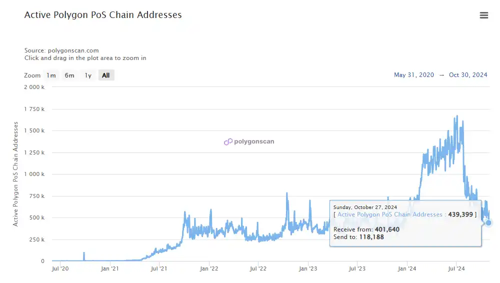 代币的市场表现同样表现不佳,2024 年 3 月到 11 月,POL 代币的价格并未跟随比特币等大盘上涨,反而一路下滑,从年初的 1.3 美元最低跌至 0.28 美元,跌幅超过 77%。在近一两个月内才开始反弹回升,近期价格已反弹至 0.6 美元左右,但距离近 3 美元的历史最高点还需增长 5 倍左右。