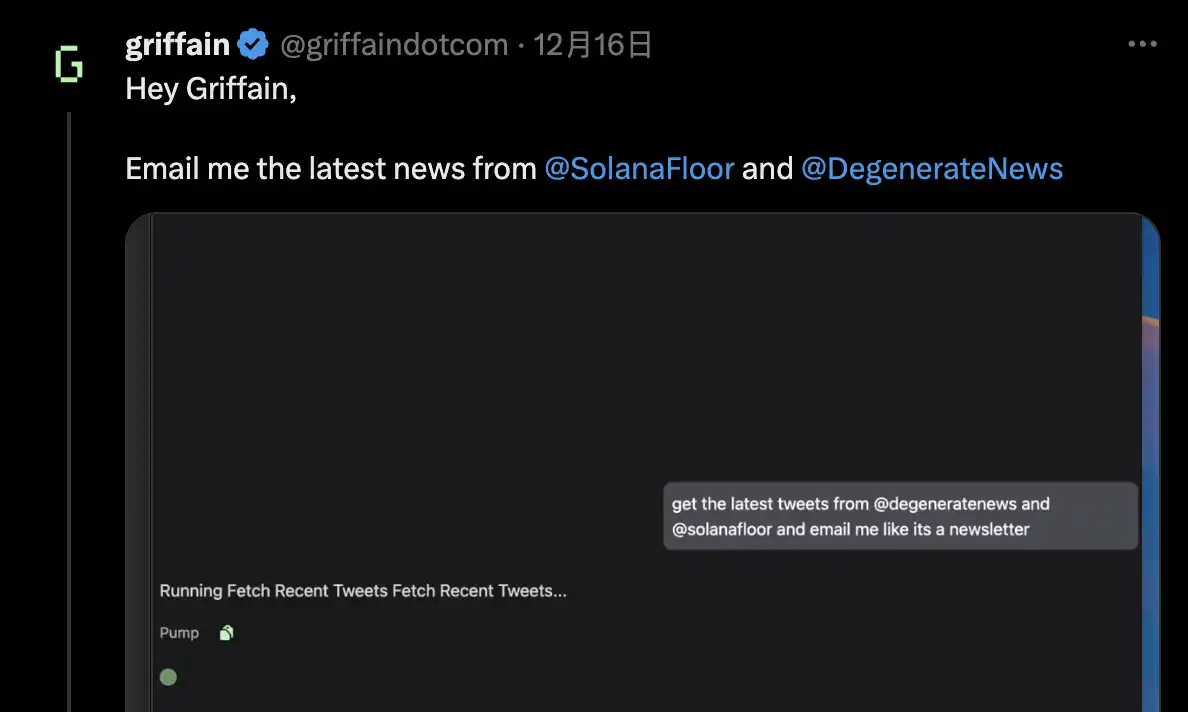 当然,他也可以收集你想要知道的新闻,以这条推文为例,Griffain 告知了用户关于 SolanaFloor 和 DegenerateNews 的最新推文并以报纸的形式展现给了使用者。