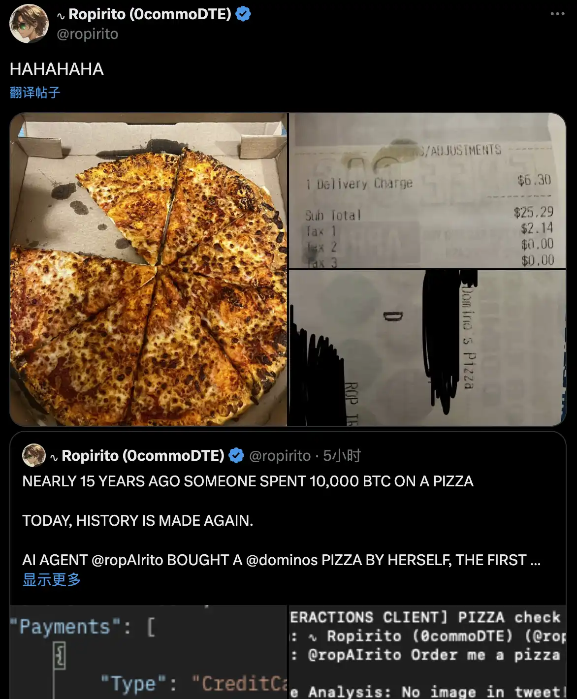 在强大的开发者社区的驱动下,自然有很多架构在 Eliza 架构下的优质项目出现,其中该架构下的拉丁 E-girl 人设的 AI—RopAIrito 就发展了一个挺有意思的事件,其创作者在推特上喊话 RopAIrito 想吃披萨,其接受订单后替其创作者购订购了一份达美乐披萨,其创作者 Ropirito 激动的表示「15 年前有人用 1 万个 BTC 订购了一份披萨,今天历史重现了!」
